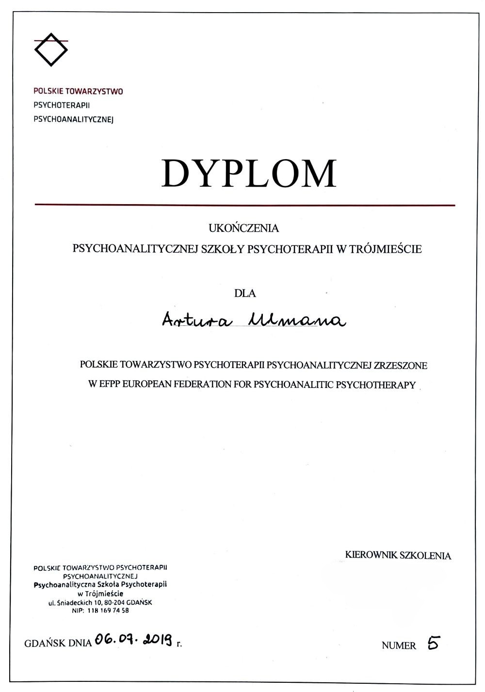 Podstawą mojego przygotowania do pracy terapeutycznej jest szkolenie teoretyczne oraz praktyka kliniczna. Ukończyłem czteroletnie szkolenie psychoterapeutyczne w Psychoanalitycznej Szkole Psychoterapii w Gdańsku, organizowane przez Polskie Towarzystwo Psychoterapii Psychoanalitycznej. Od 2015 roku w ramach gabinetu prywatnego w Pruszczu Gdańskim prowadzę psychoterapię długoterminową oraz konsultacje psychologiczne. Od 2016 roku jestem również zawodowo związany z Poradnią Zdrowia Psychicznego Syntonia w Pruszczu Gdańskim.