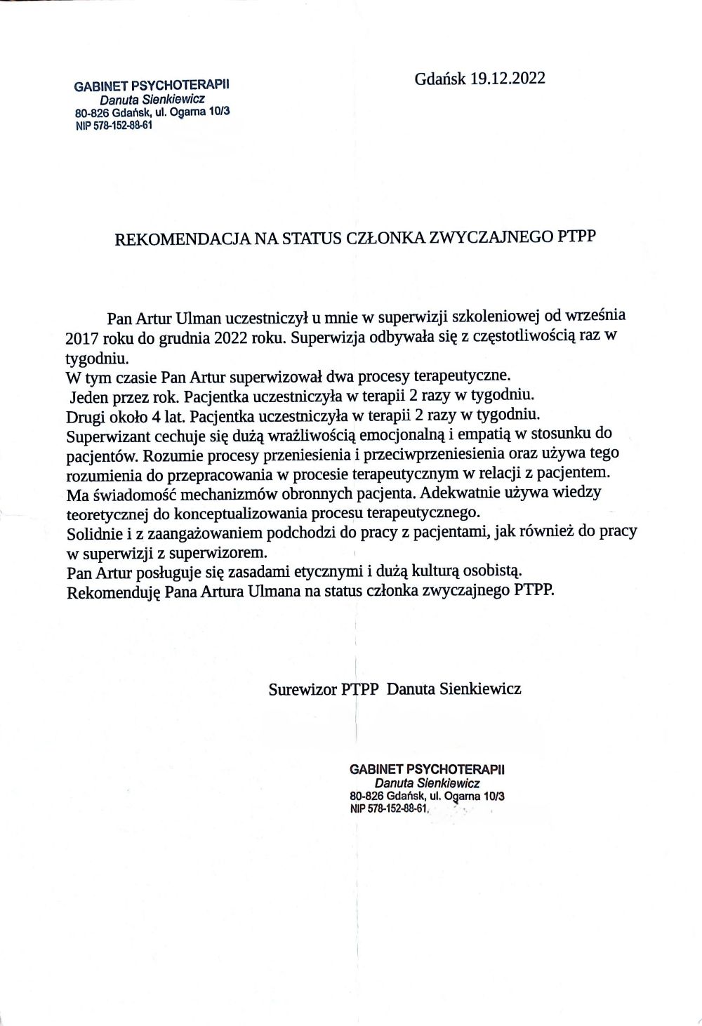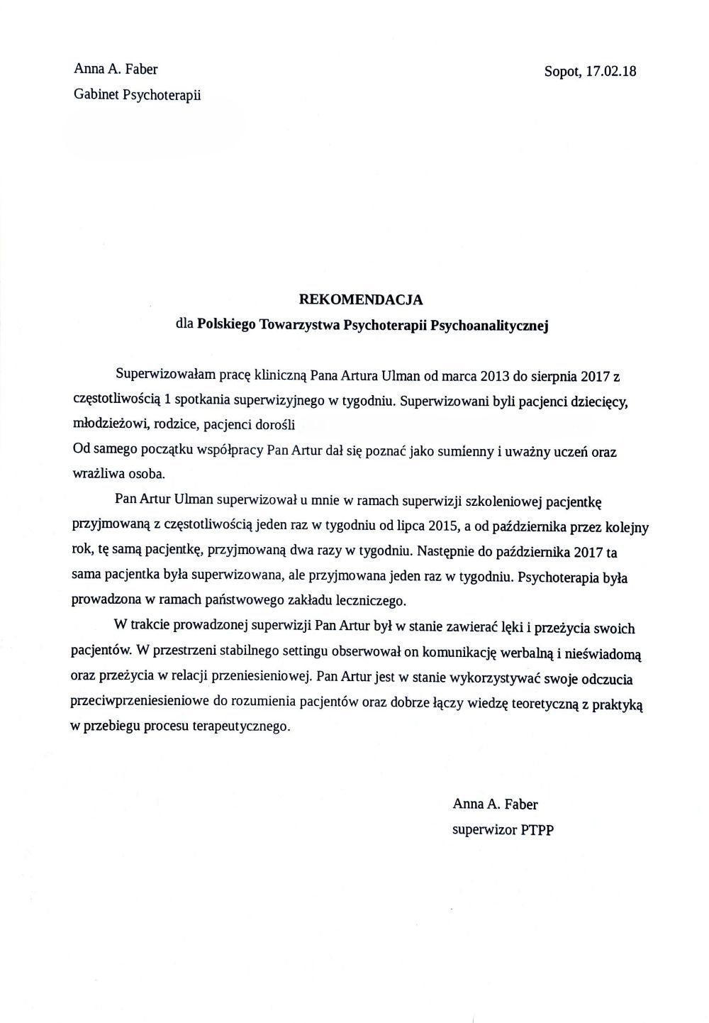 Swoją pracę poddaję regularnej superwizji, u superwizora Polskiego Towarzystwa Psychoterapii Psychoanalitycznej. Jestem członkiem nadzwyczajnym Polskiego Towarzystwa Psychoterapii Psychoanalitycznej.